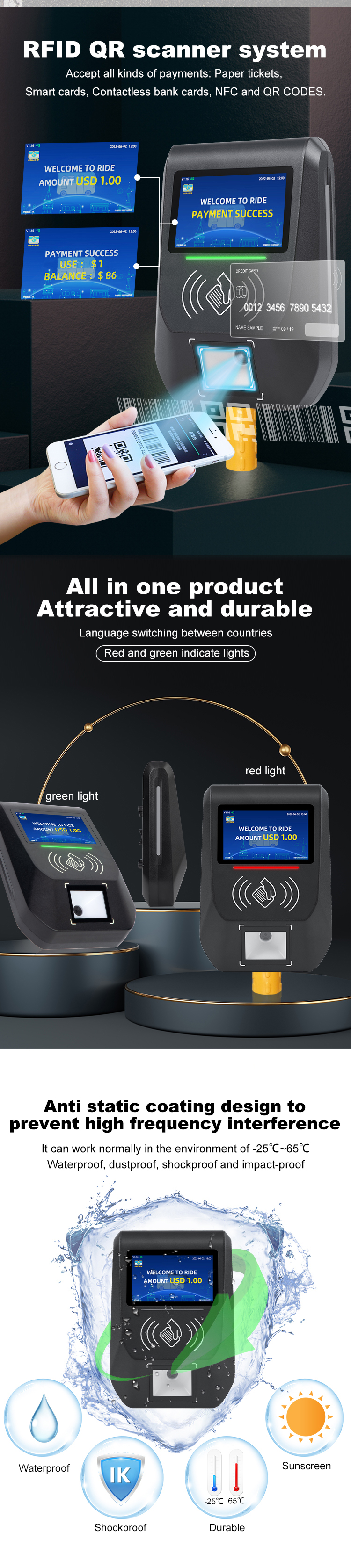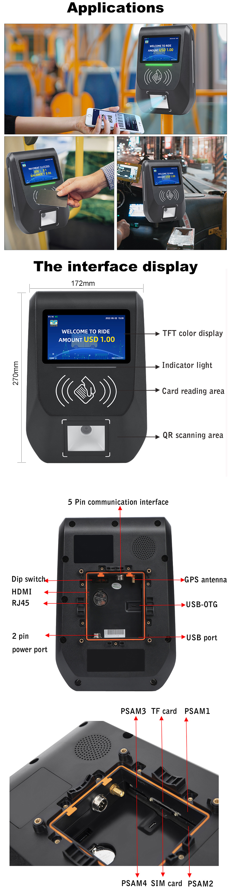 The main functions of the CARDLAN bus card payment terminal CL-A0618 include wireless communication, GPS positioning, IC card reading, electronic payment, and balance inquiry. The bus card payment terminal CL-A0618 adopts a 5-inch TFT-LCD display screen, with live language broadcasting and language prompts during transactions. It supports successful/failed card swiping with light prompts, online/offline consumption data collection, waterproof, dustproof, shockproof, and anti-collision.
